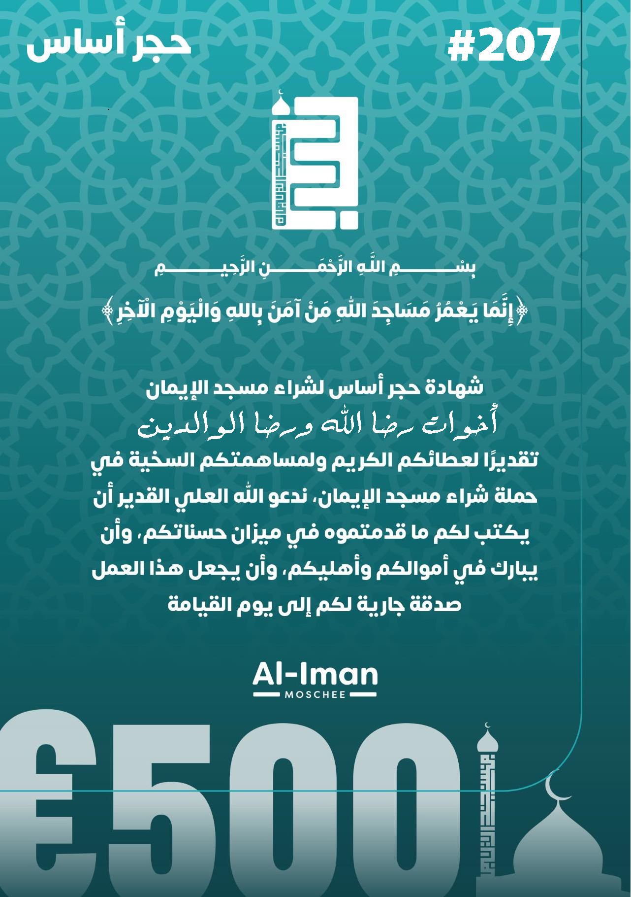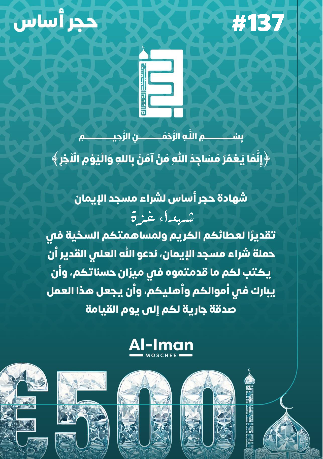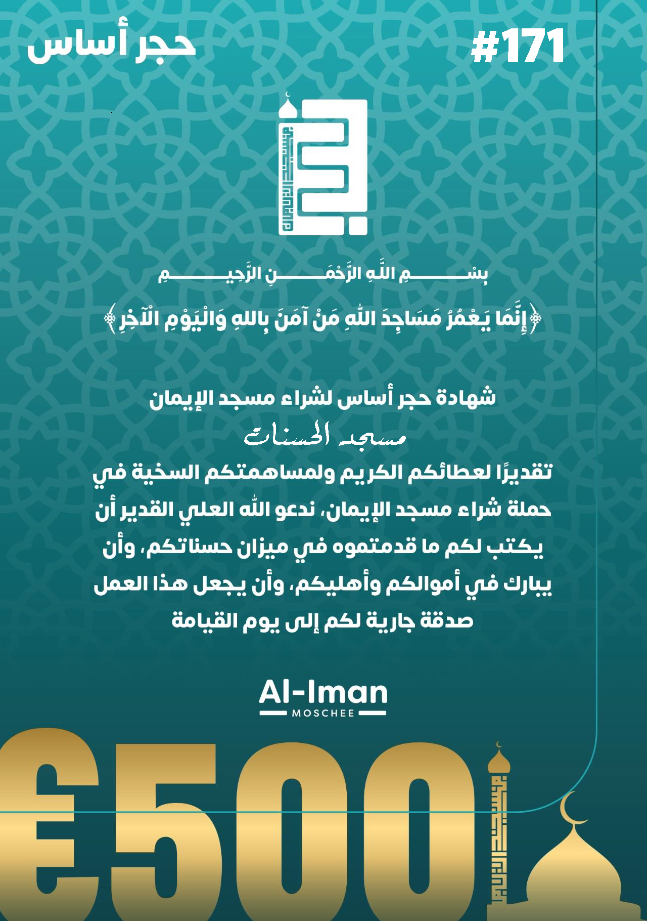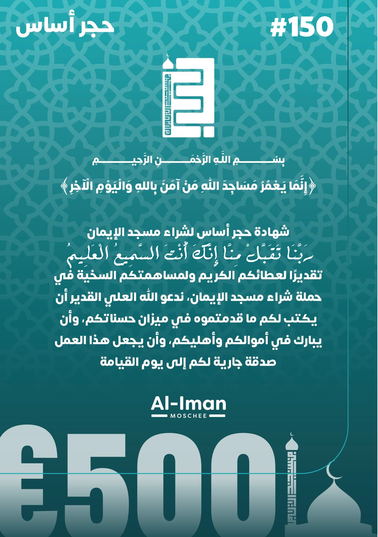 مساهمتك الصغيرة اليوم تؤسس بداية قوية لمسجد الإيمان وخدمته.